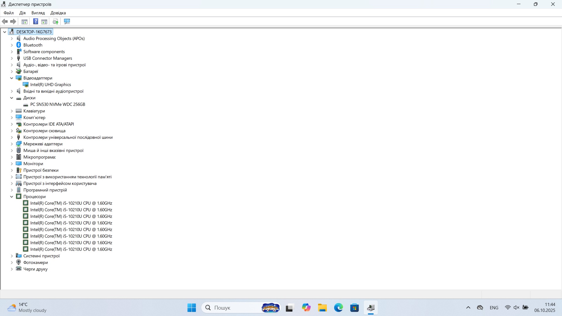 Процесор: Intel Core i5-10210U, 4 ядра 8 потоків, 1.6 – 4.2 ГГц.