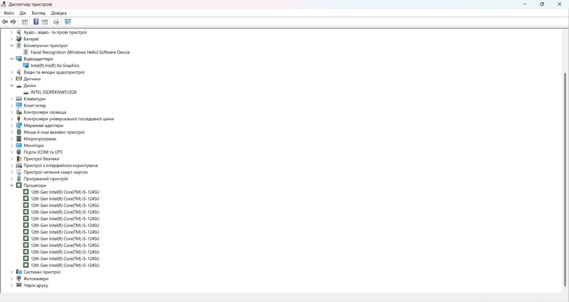 Процесор: Intel Core i5-1245U, 10 ядер 12 потоків, 3.3 – 4.4 ГГц.