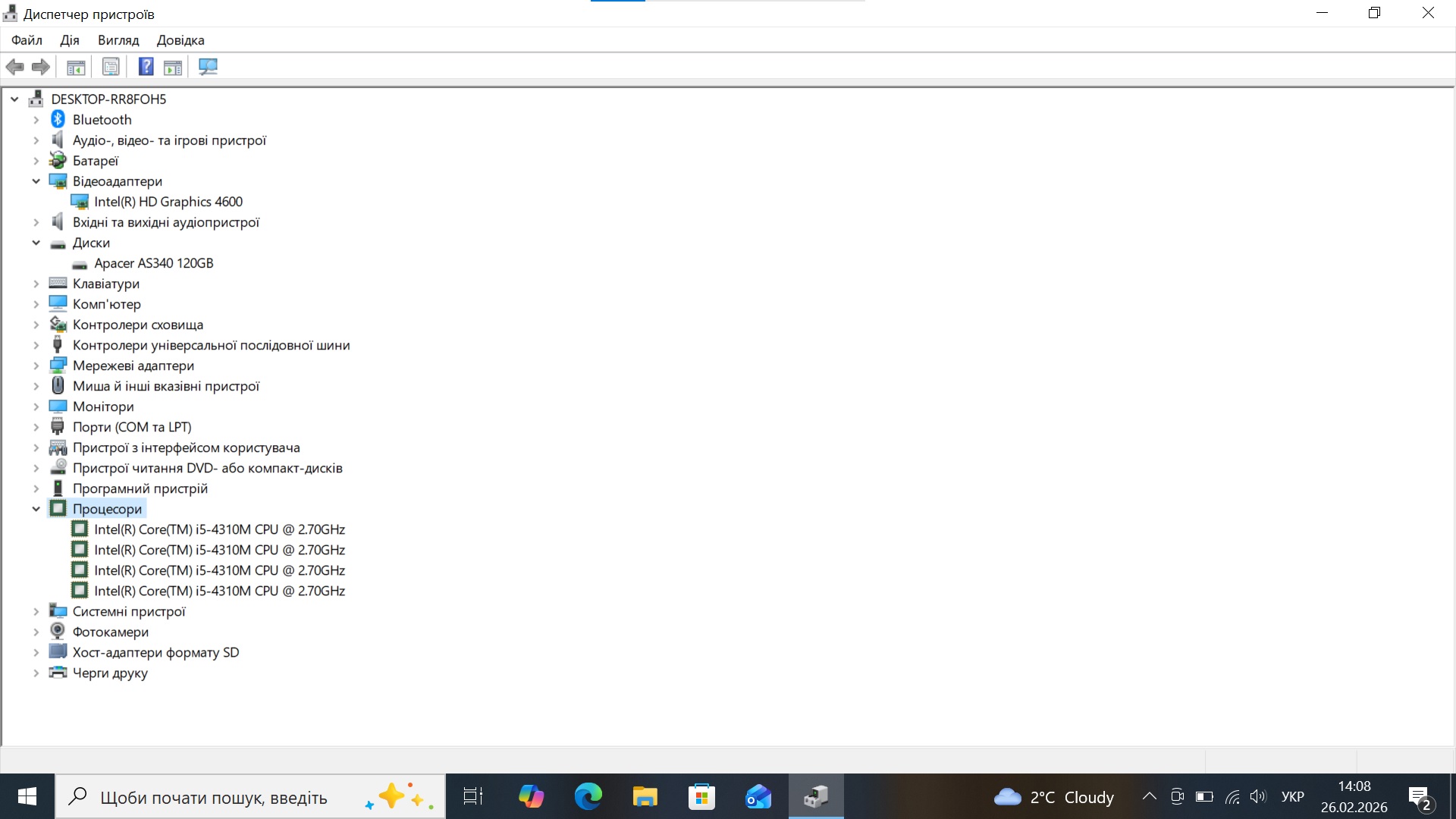 Процесор: Intel Core i5-4310M, 2 ядра 4 потоки, 2.7-3.4 ГГц.