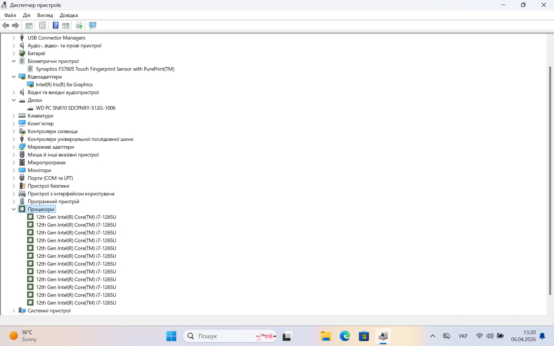 Процесор: Intel Core i7-1265U, 10 ядер 12 потоків, 3.6-4.8 ГГц.