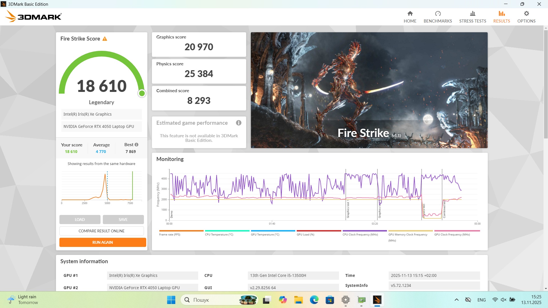 Відеокарта: NVIDIA GeForce RTX 4050 Laptop GPU 6 Гб, Intel(R) Iris(R) Xe Graphics.