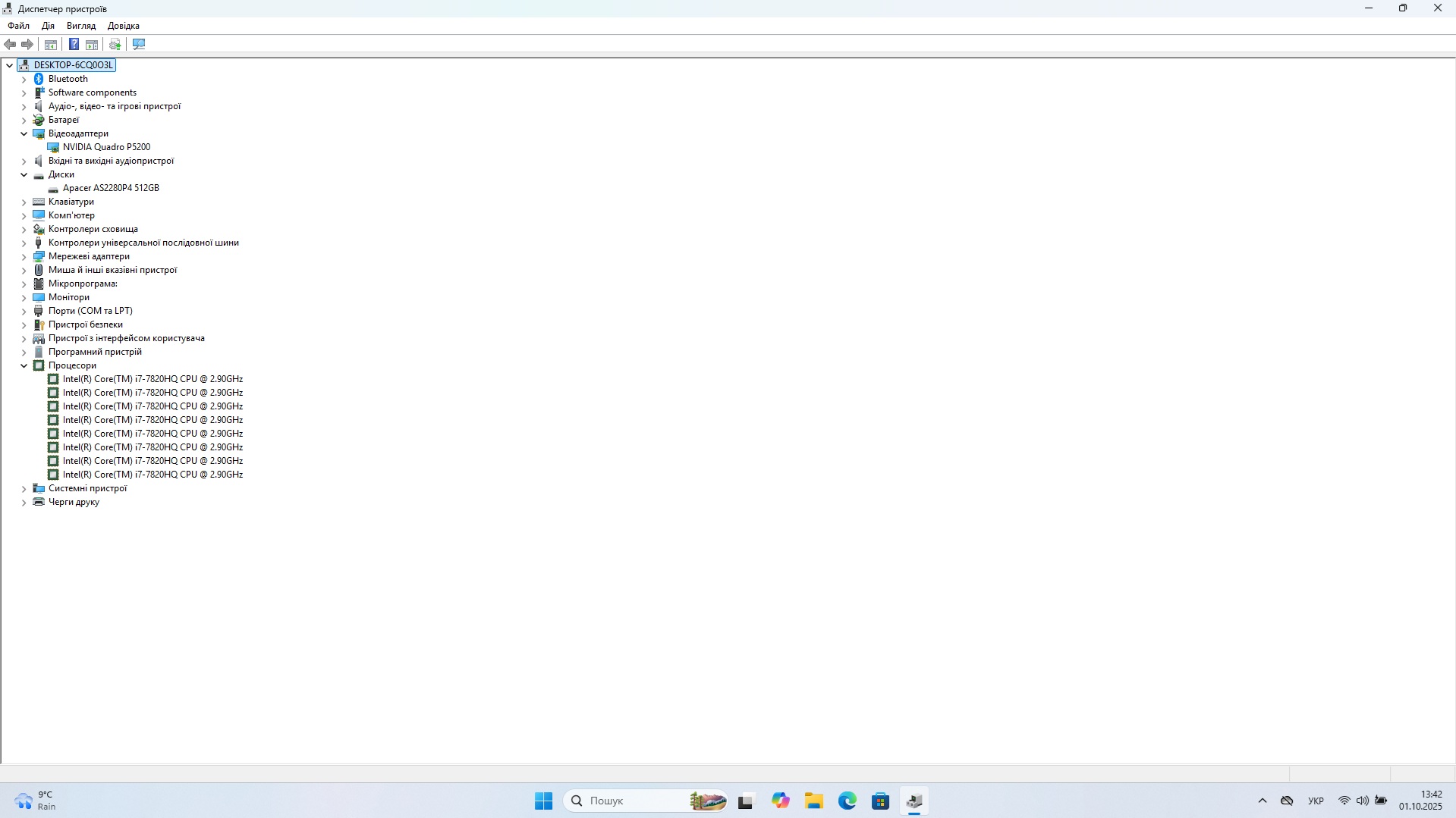 Процесор: Intel Core i7-7820HQ, 4 ядра 8 потоків, 2.9-3.9 ГГц.