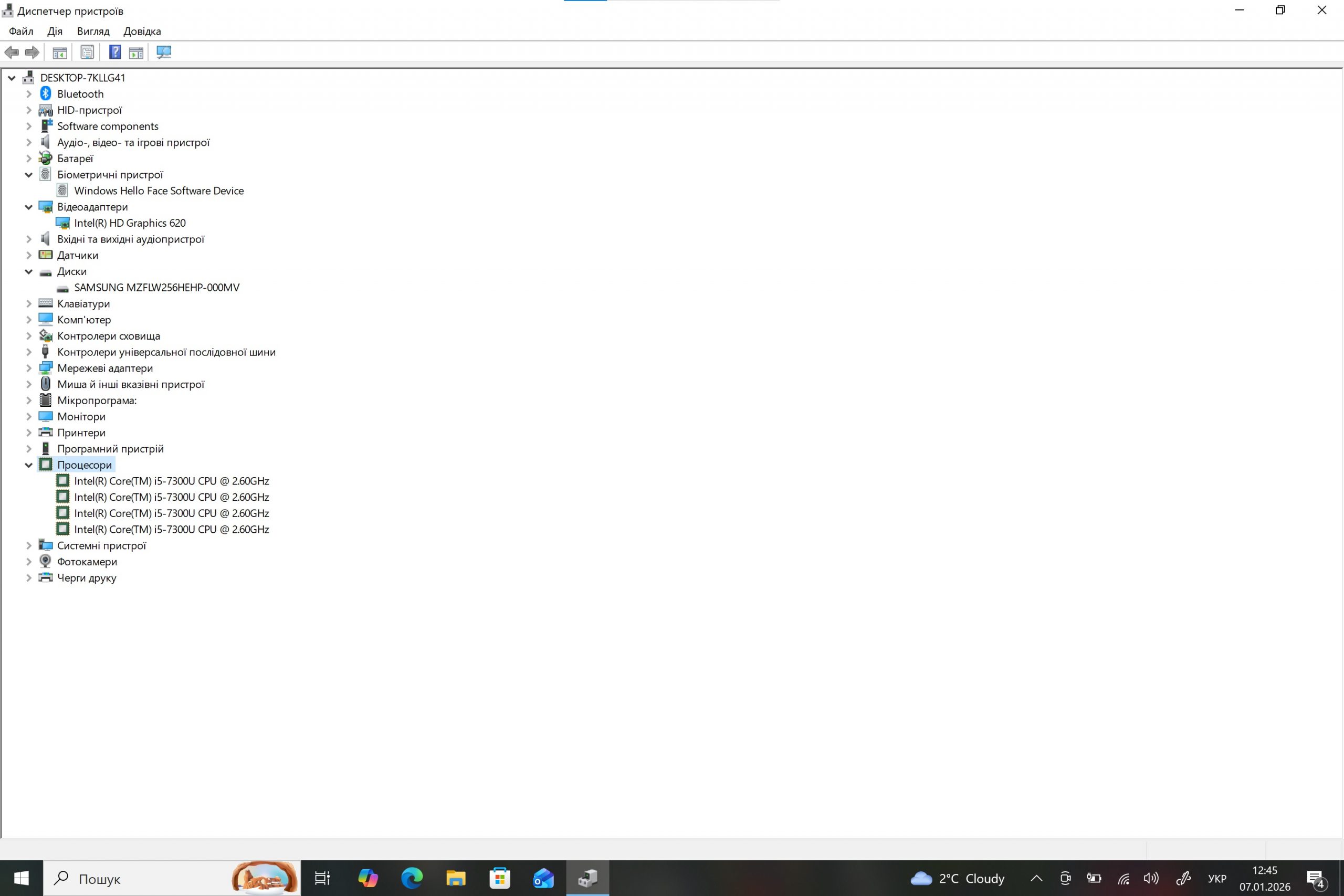 Процесор: Intel Core i5-7300U, 2 ядра 4 потоки, 2.6-3.5 ГГц.