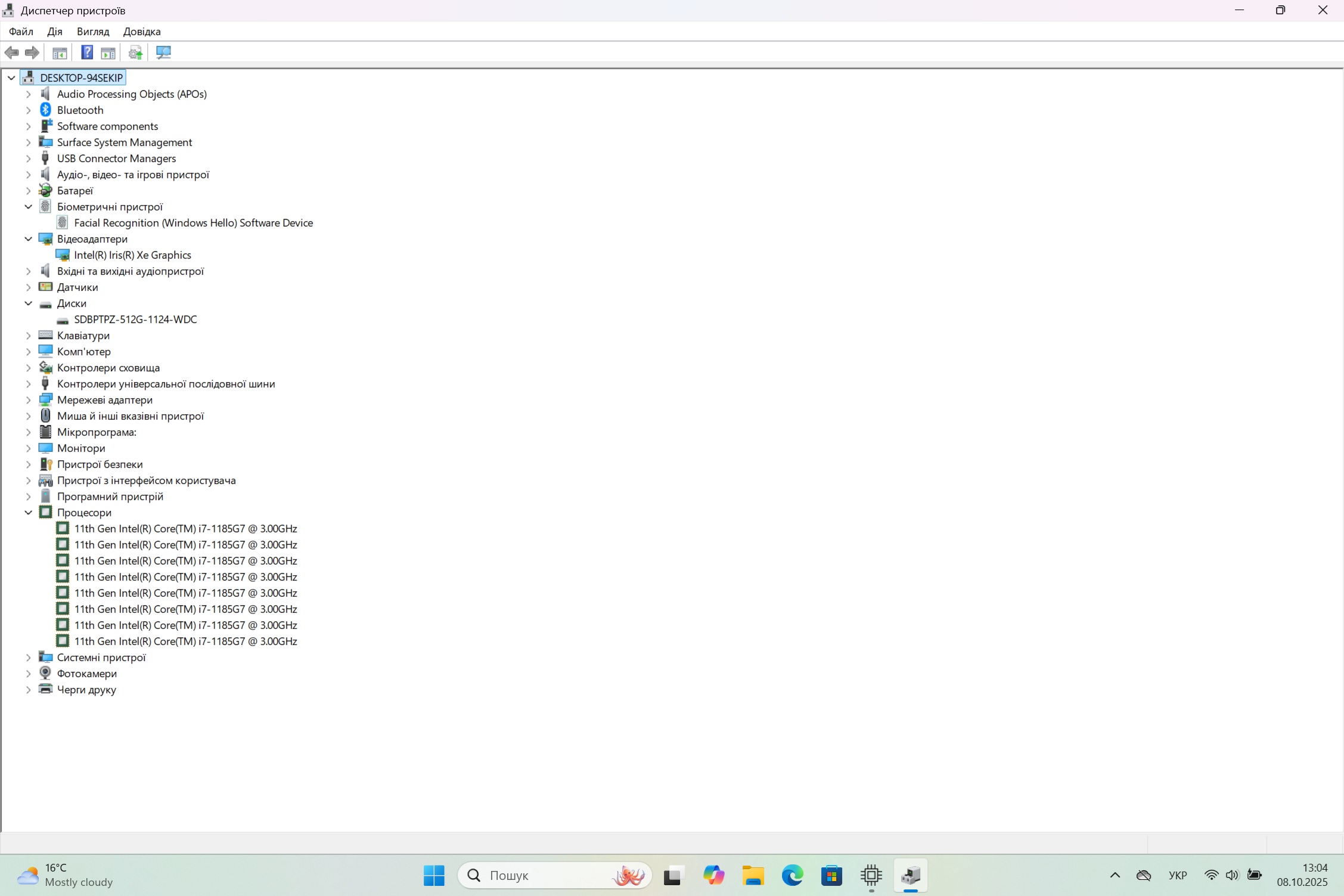 Процесор: Intel Core i7-1185G7, 4 ядра 8 потоків, 3.0-4.8 ГГц.