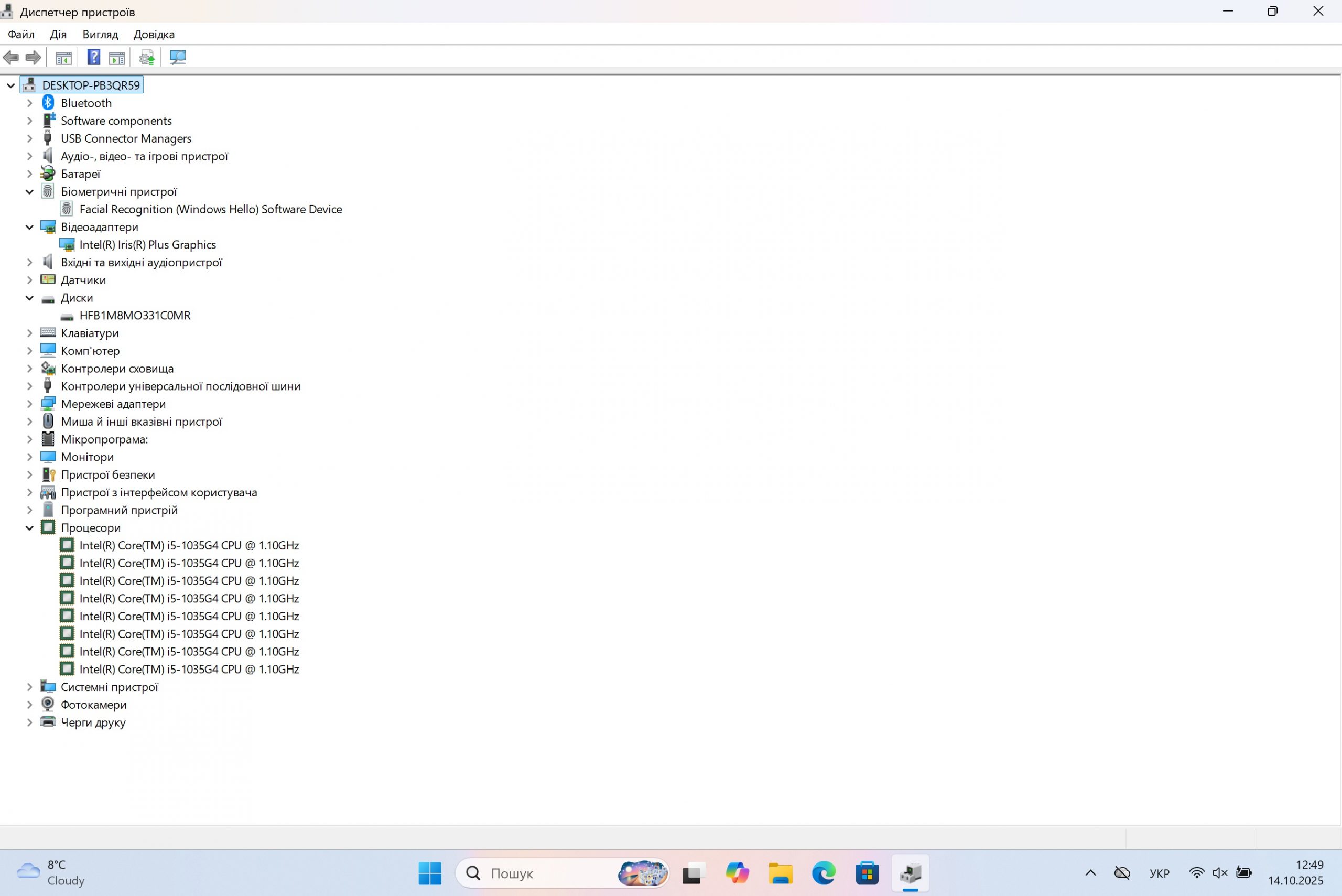 Процесор: Intel Core i5-1035G4, 4 ядра 8 потоків, 1.1-3.7 ГГц.