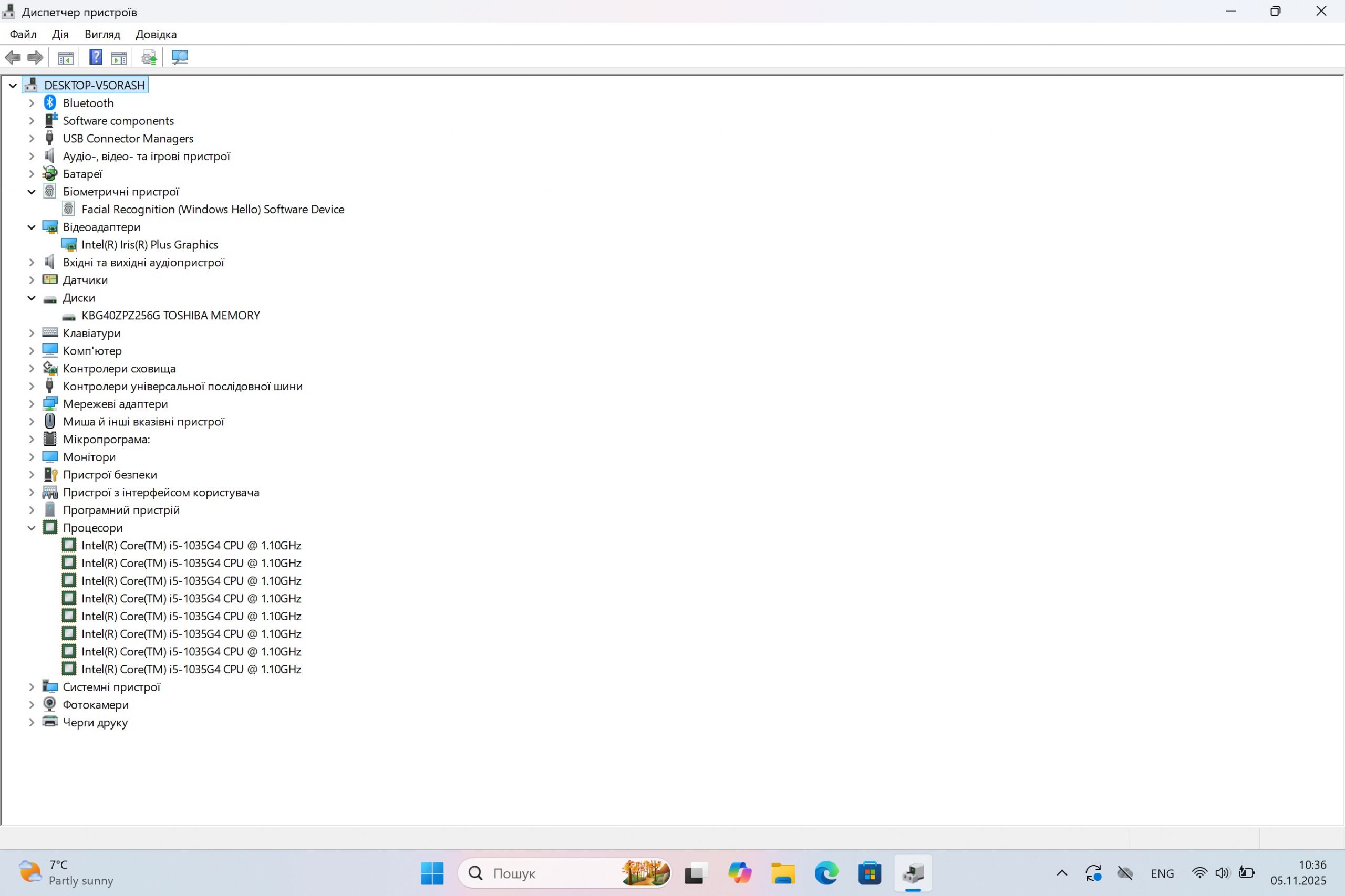 Процесор: Intel Core i5-1035G4, 4 ядра 8 потоків, 1.1-3.7 ГГц.